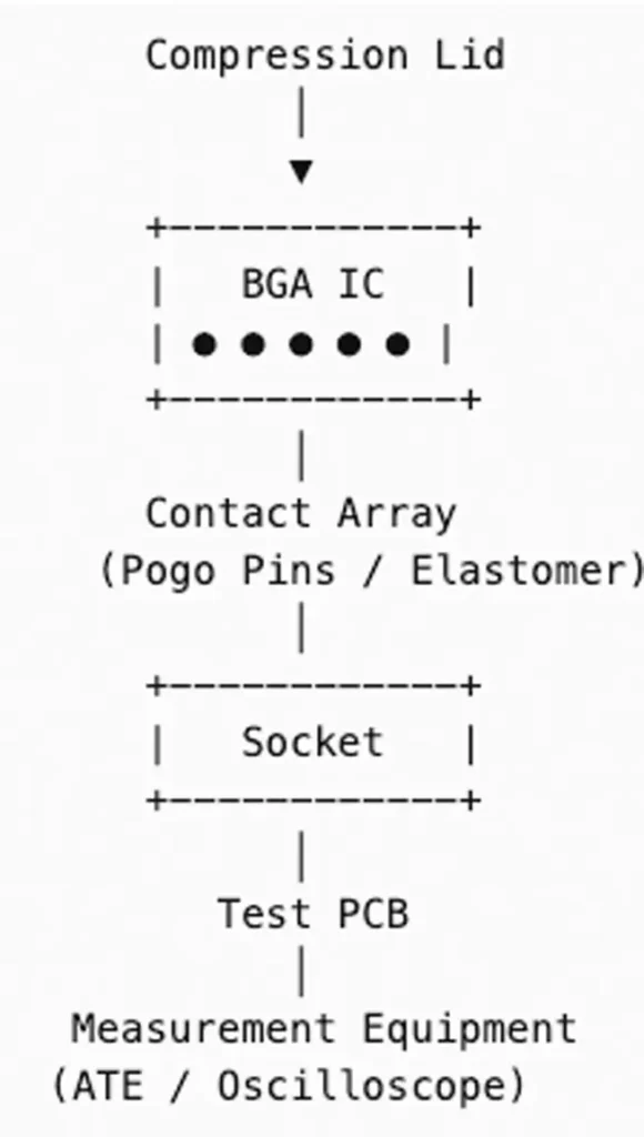 Instead of solder joints, the socket uses precision contact mechanisms such as spring probes or elastomer contacts to create electrical connections.